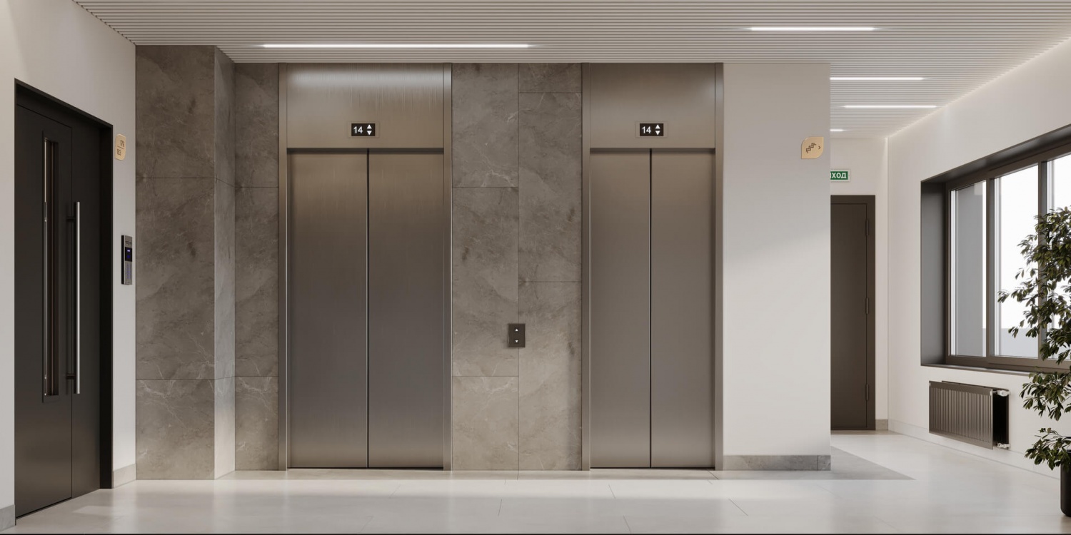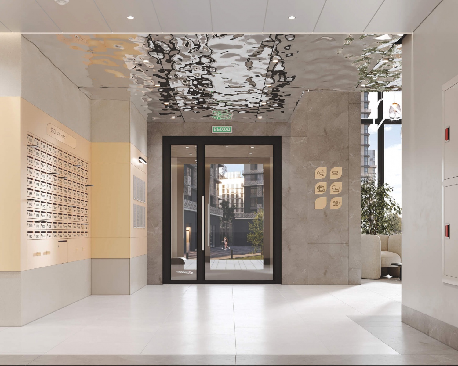 Современный и минималистичный дизайн интерьера лобби с гостевым санузлом, колясочными и лапомойками
