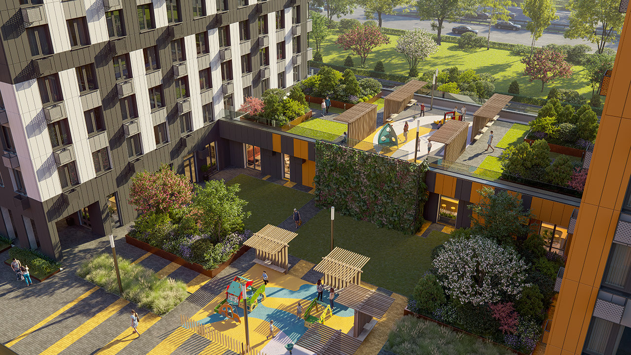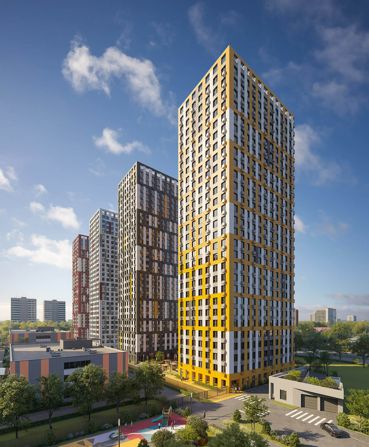 Группа компаний Садовое кольцо представляет новый проект высотного жилого комплекса квартал «Тетрис», расположенный в городе Красногорске Московской области. Запланировано строительство 9жилых корпусов переменной этажности: от 26 до 32 этажей и объектов инфраструктуры. Здесь будут построены школа на 130 мест, детский сад на 260 мест, медицинский центр, торгово-развлекательный комплекс, гостиница, многоуровневый и перехватывающий паркинг; модернизирован транспортно-пересадочный узел; реконструирована станция «Павшино»; запроектированы надземные пешеходные переходы. Общая площадь застройки составит 10,4 Га. Архитектурный облик комплекса сочетает простые лаконичные формы и яркие, насыщенные краски фасадов.