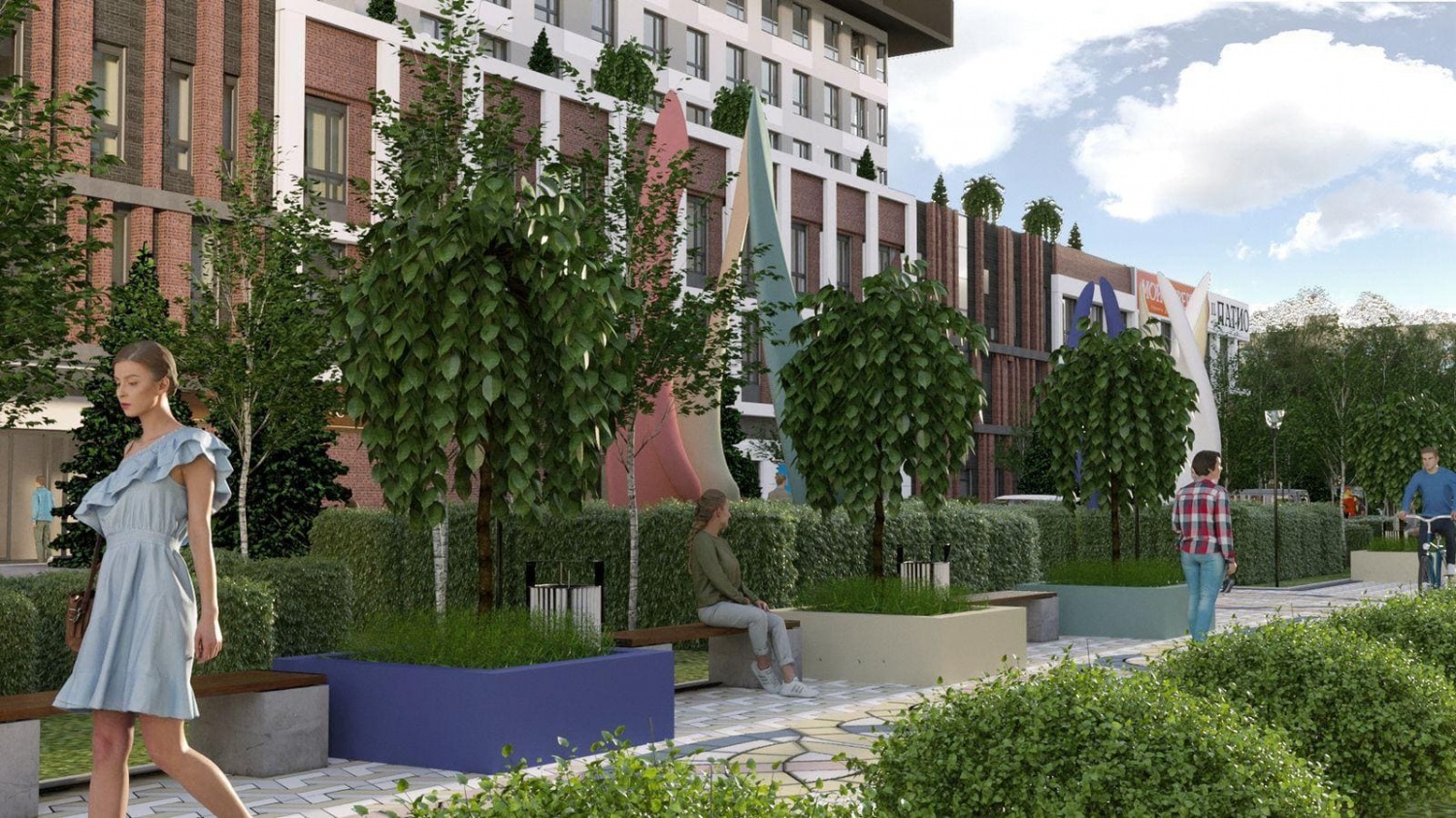 Придомовая территория будет благоустроена и оборудована четырьмя детскими и четырьмя спортивными площадками, обеспечивая место для активного досуга и развития детей.