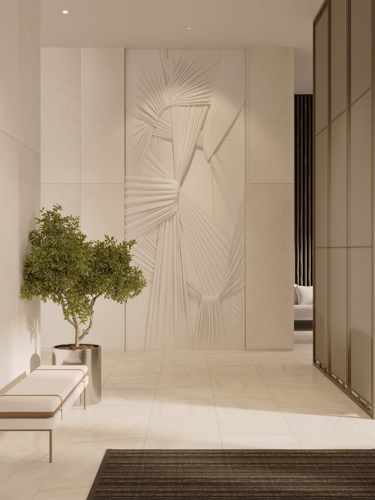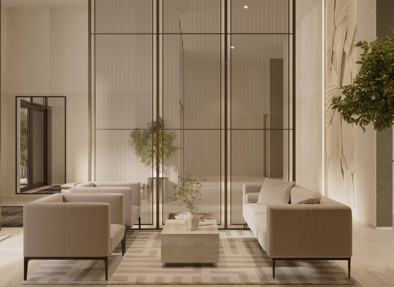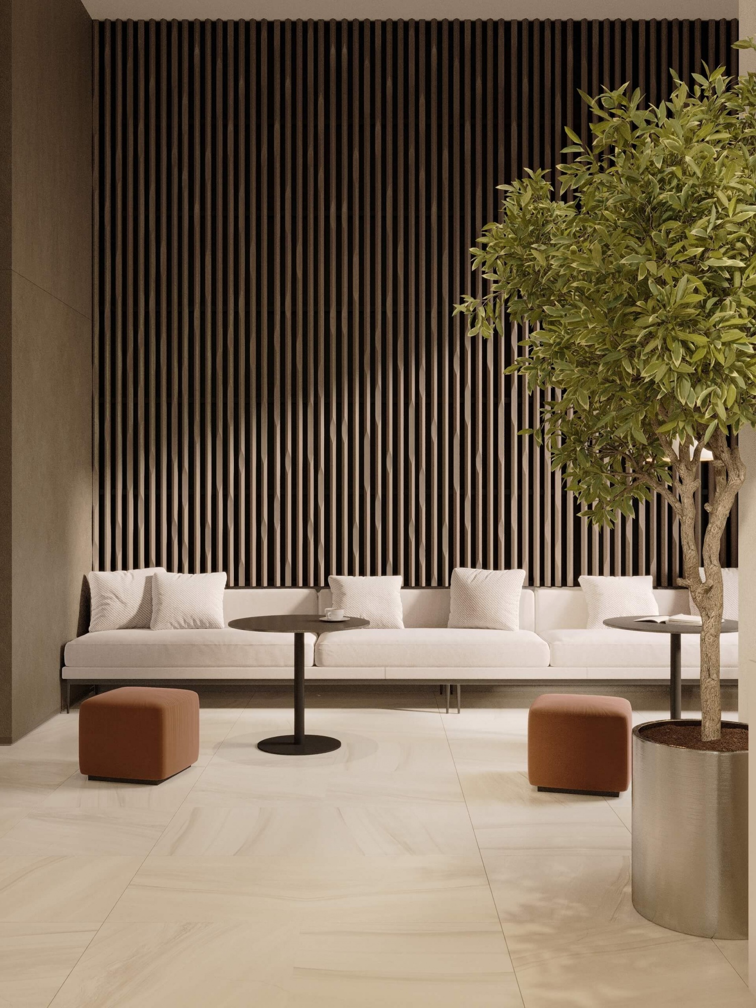 Комфортные глазу тона, уютная и удобная мебель, тёплый свет, скульптуры, много живых растений — так выглядят лобби в нашем новом проекте.