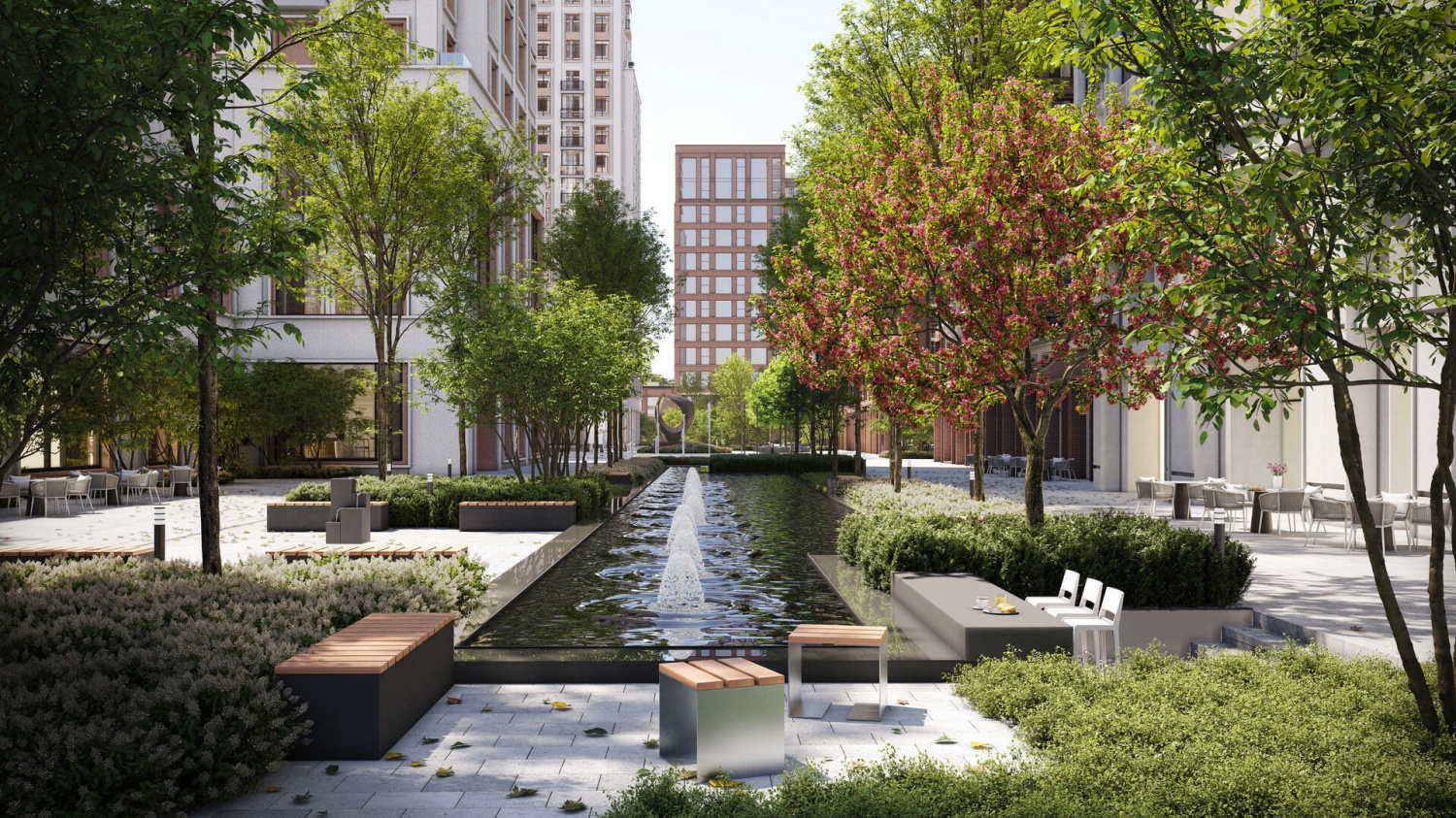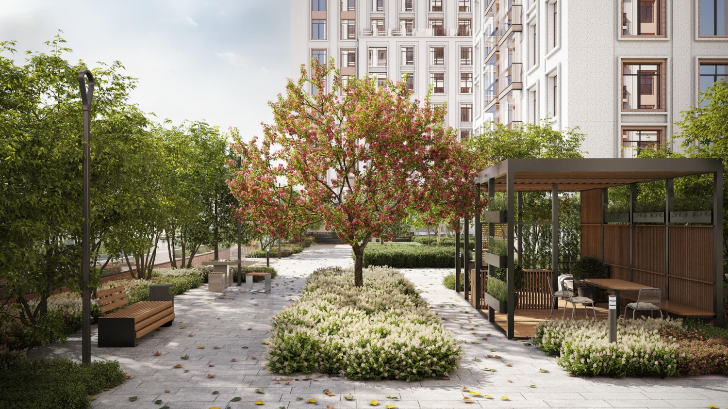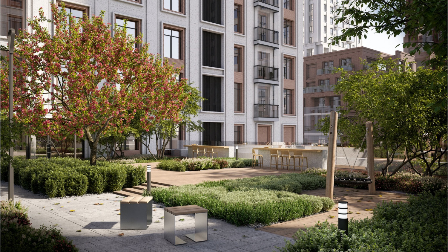 Во дворах мы разобьём камерные сады — тихие и спокойные, в отличие от оживлённых внешних променадов. Взрослые деревья, кустарники, злаковые травы и многолетники, подобранные по календарю цветения, сформируют плотный разноуровневый зелёный каркас, который круглый год будет радовать глаз. Зелёные буферы помогут организовать приватные зоны для игр, отдыха, спорта, их мы заполним качественной экологичной мебелью и оборудованием.