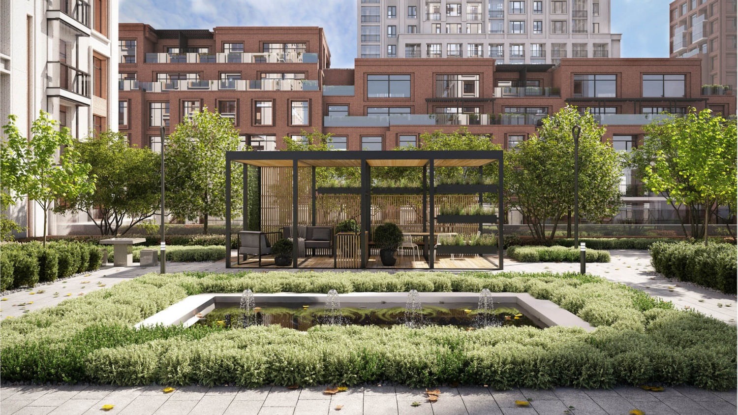 Для жителей первой очереди на крыше торгово-развлекательного центра мы спроектировали большой зелёный приватный двор-сад. Здесь мы высадим многолетники и взрослые растения 一 сосны, канадскую иргу, сирень. Обустроим коворкинг, детскую зону с песочницей и место для отдыха с лежаками. Летом у зоны с водным объектом можно заниматься фитнесом и йогой. А зимой наша управляющая компания поставит здесь ёлку и украсит перголы, создавая новогоднее настроение.