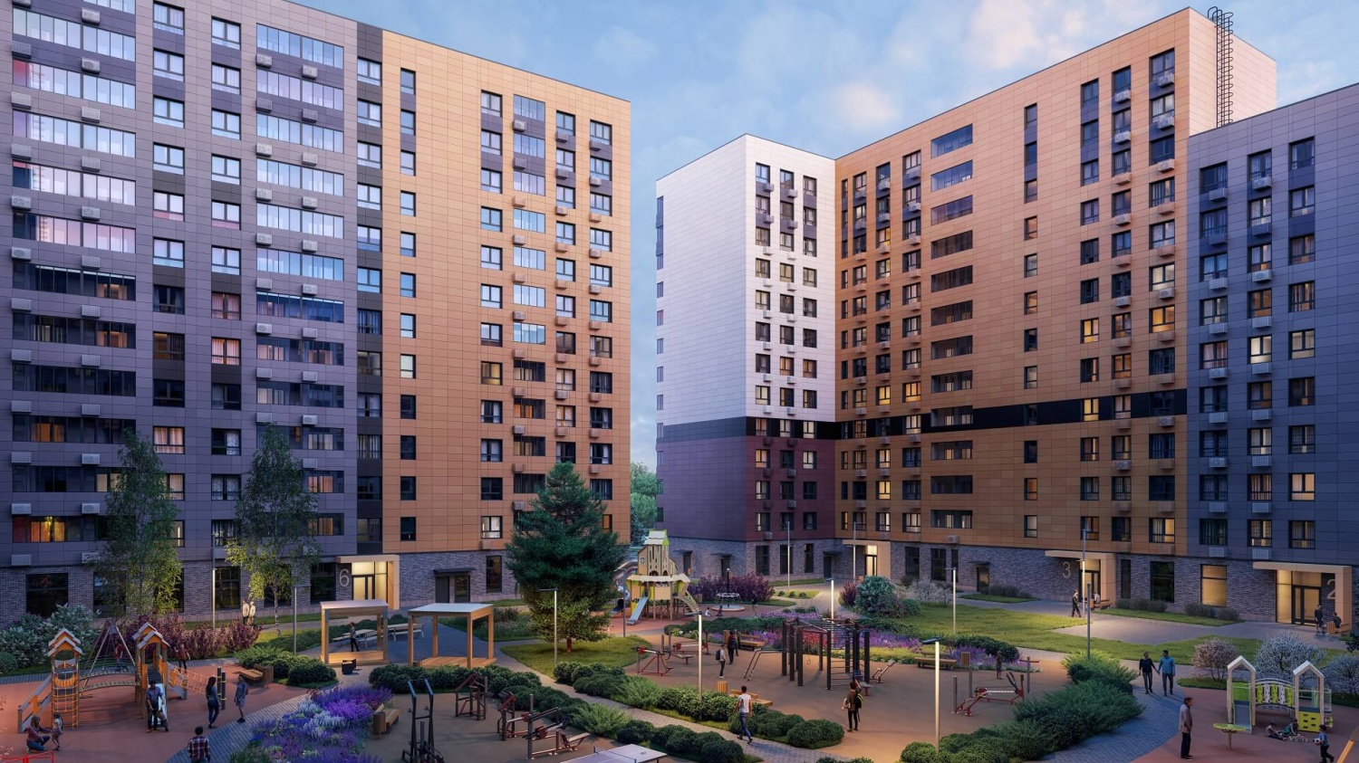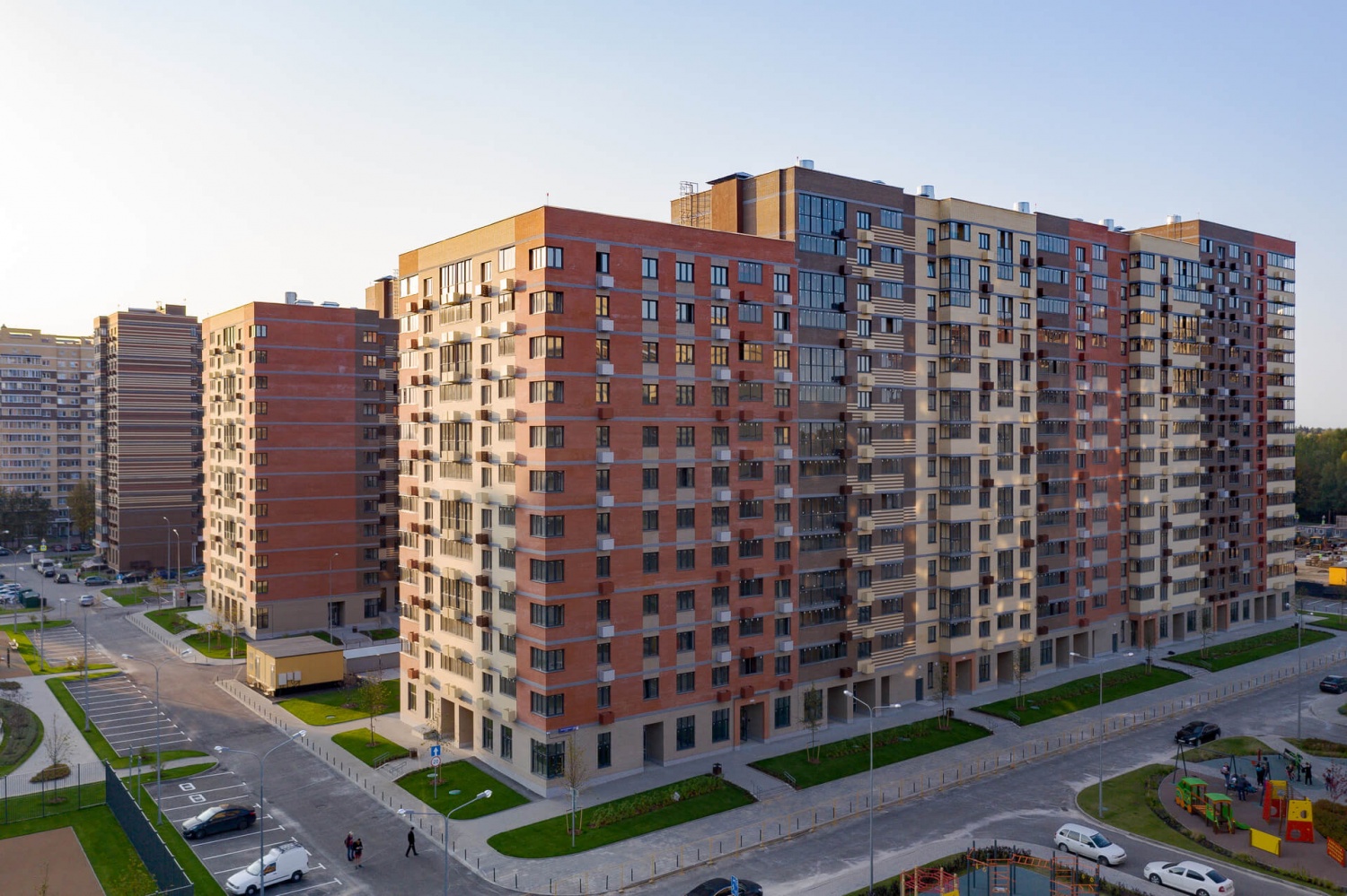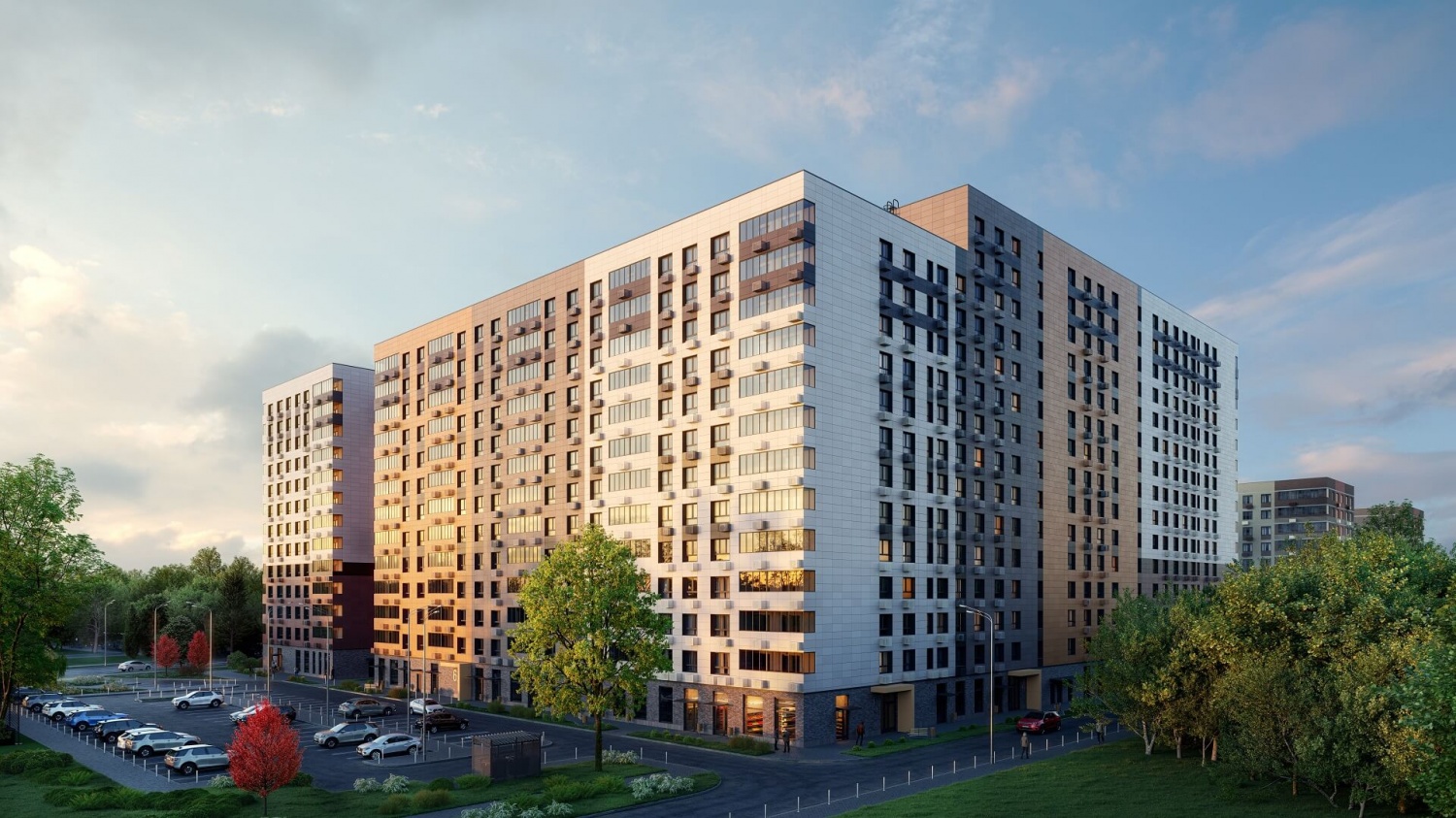 На территории микрорайона возводятся кирпично-монолитные дома переменной этажности – от 6 до 17 этажей. Дома выполнены в бежево-шоколадной гамме. В домах запроектированы квартиры-студии, 1, 2 и 3-комнатные квартиры площадью от 28 до 73 кв. м. В большинстве квартир имеется остекленный балкон, однако в некоторых квартирах балкона нет. Все квартиры передаются покупателям без отделки.