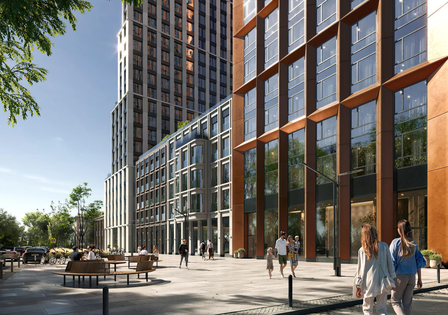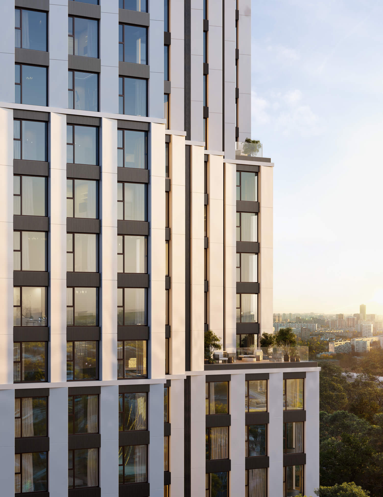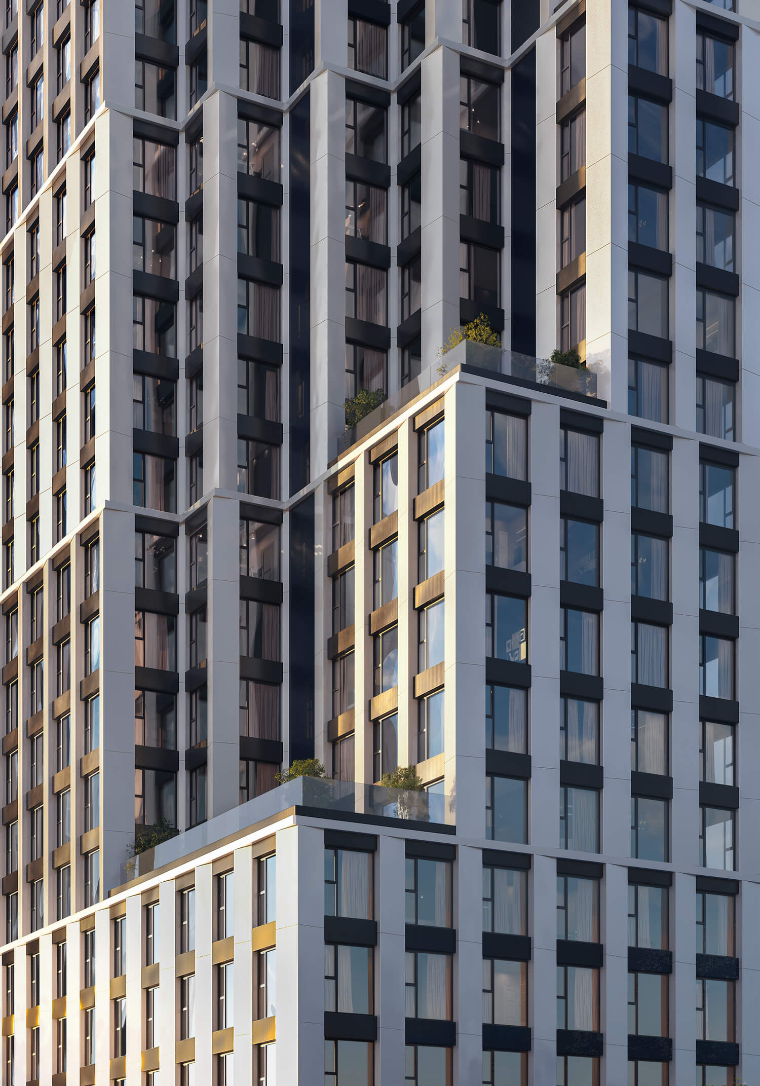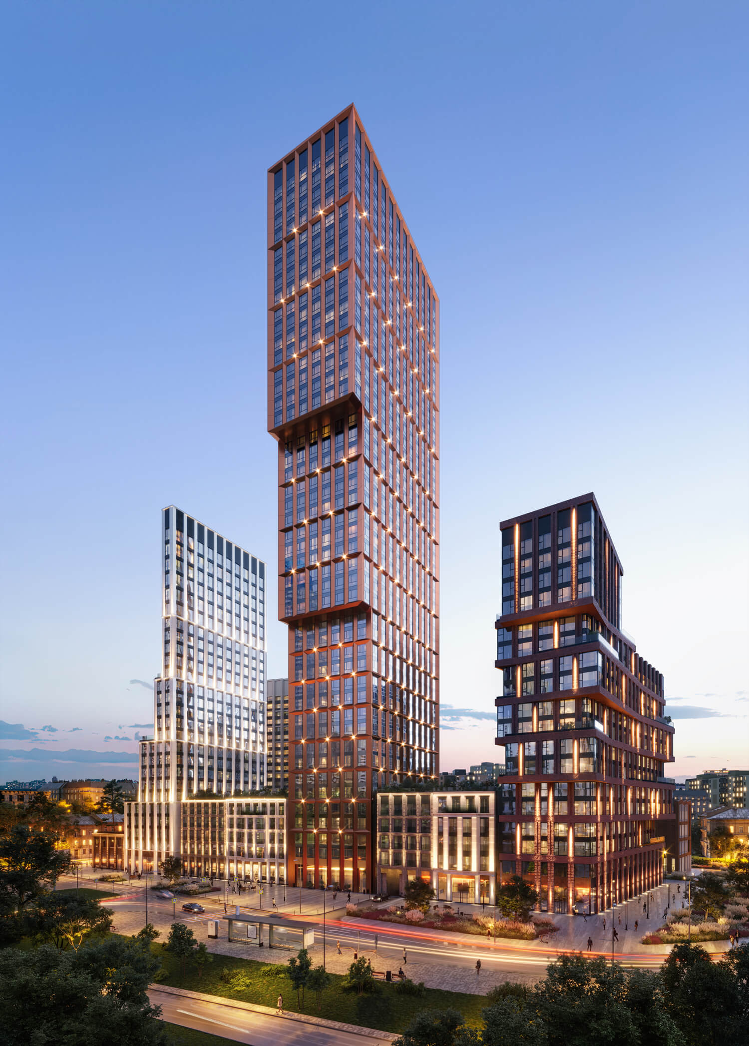 В состав комплекса входят три башни высотой 18, 26 и 44 этажа, каждая из которых имеет свой запоминающийся силуэт. Между собой башни связаны среднеэтажными строениями с индивидуальными фасадами. Композиция и пластика корпусов, а также панорамное остекление башен обеспечивают квартиры максимальным количеством дневного света и выигрышными видами на центр города и Москву-Сити. Упор на функциональность не лишает проект его уникального образа — все башни имеют неординарную форму с харизматичными уступами и консолями.