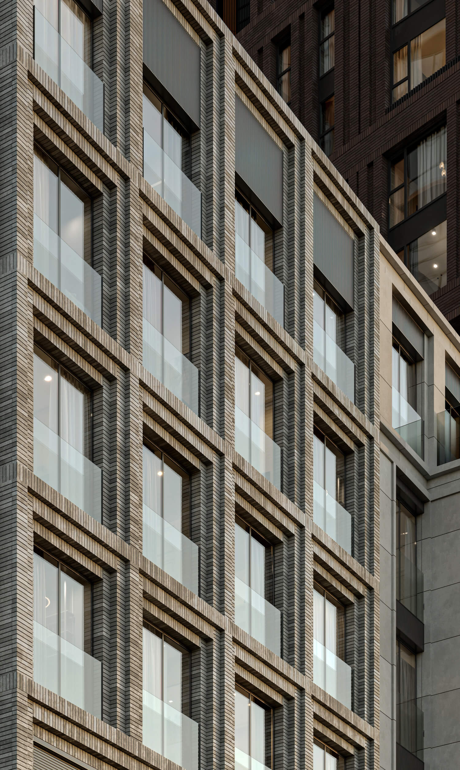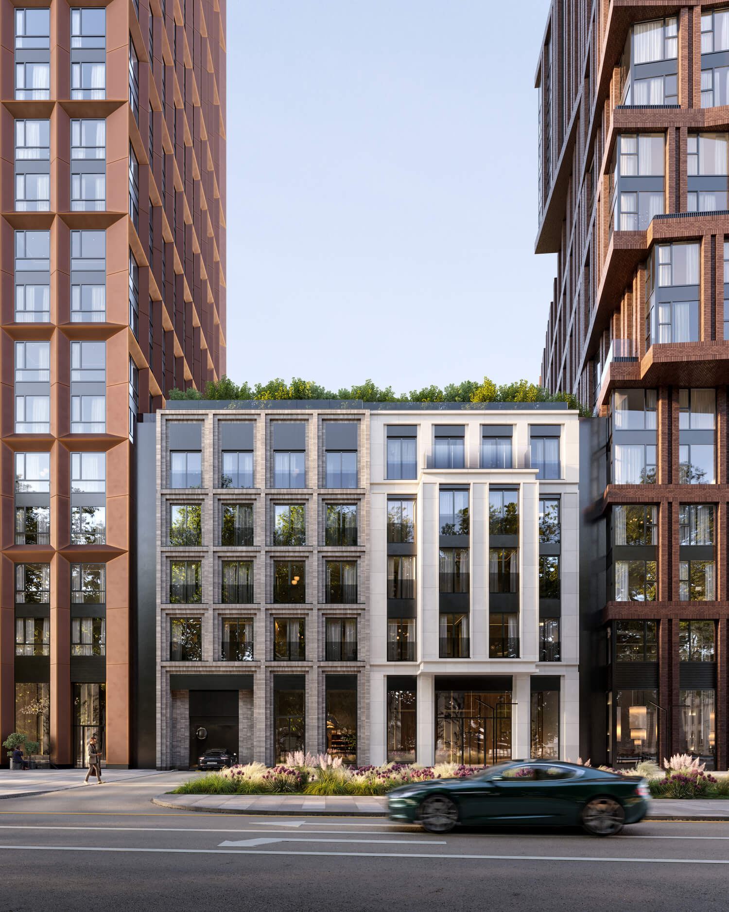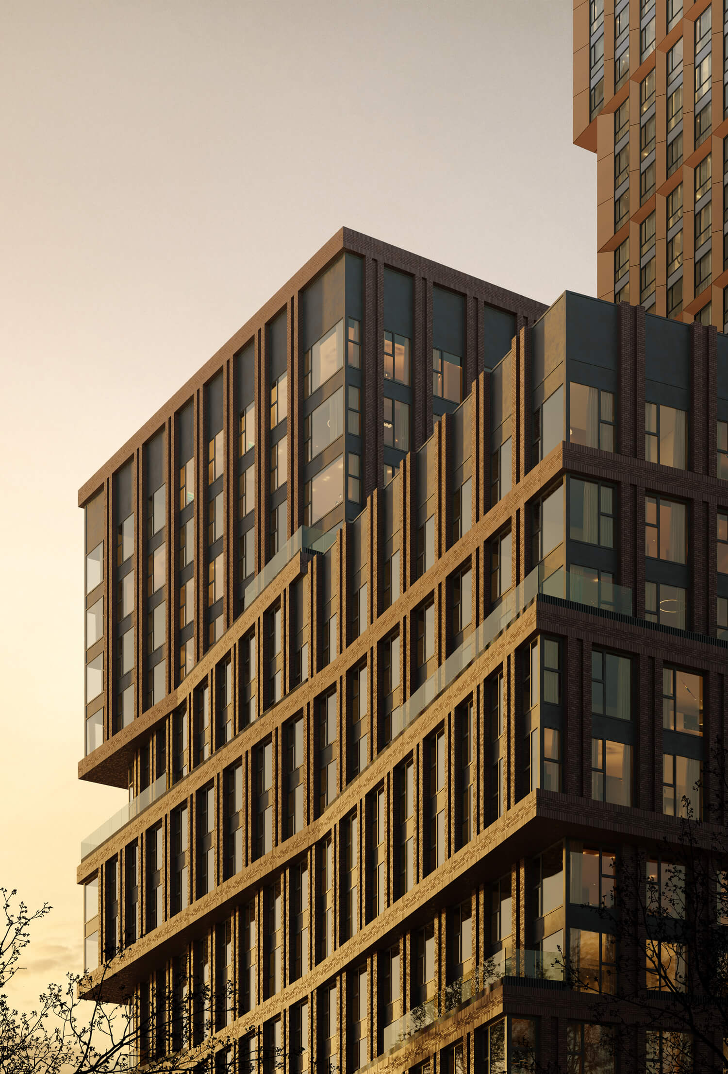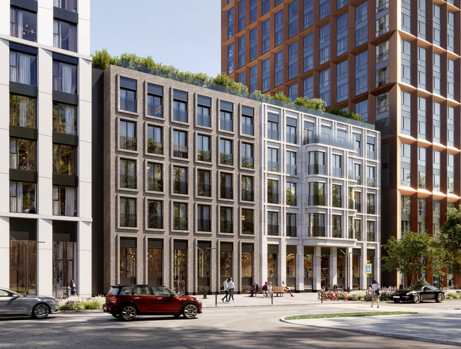 В состав комплекса входят три башни высотой 18, 26 и 44 этажа, каждая из которых имеет свой запоминающийся силуэт. Между собой башни связаны среднеэтажными строениями с индивидуальными фасадами. Композиция и пластика корпусов, а также панорамное остекление башен обеспечивают квартиры максимальным количеством дневного света и выигрышными видами на центр города и Москву-Сити. Упор на функциональность не лишает проект его уникального образа — все башни имеют неординарную форму с харизматичными уступами и консолями.