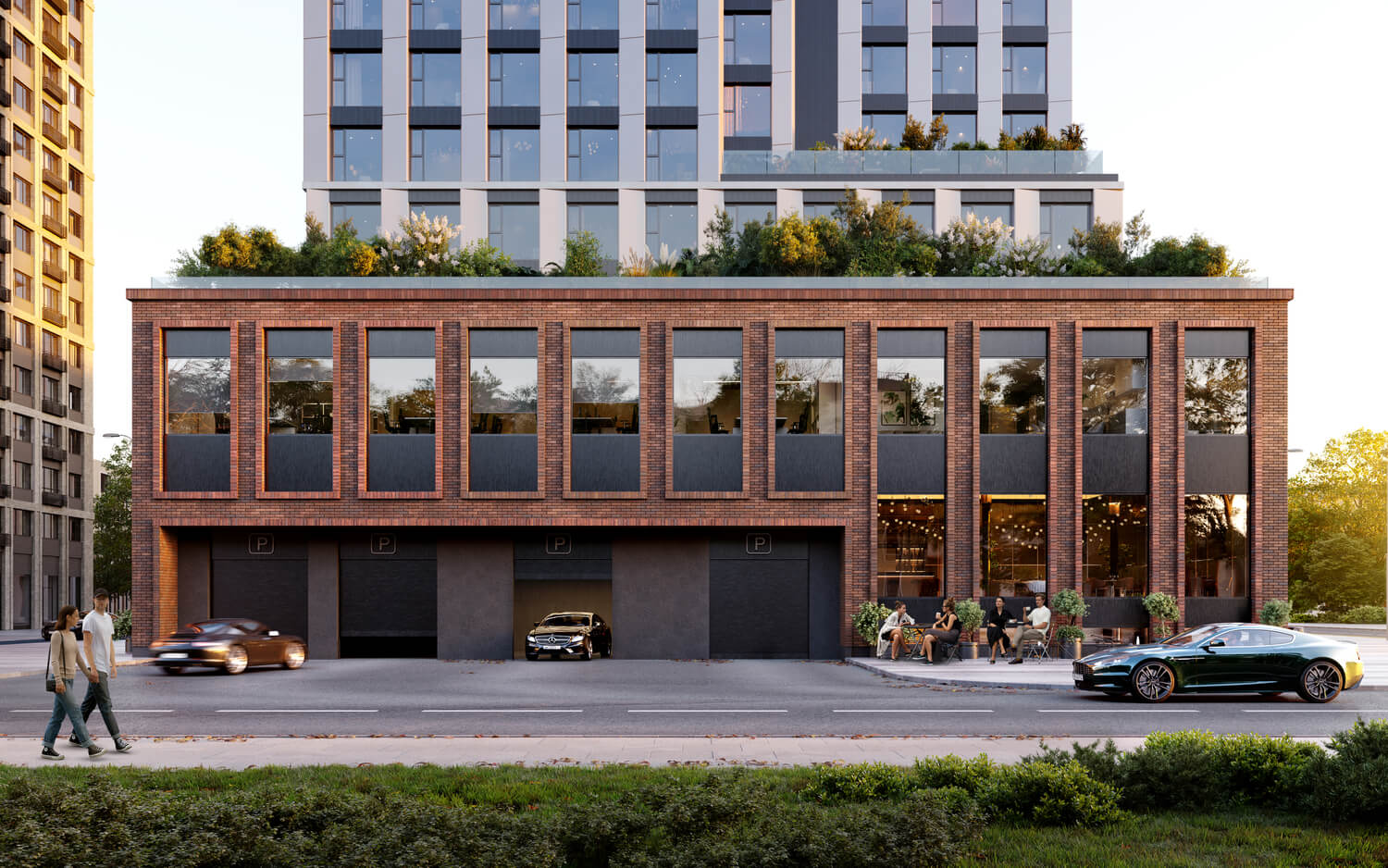 Проект спроектирован с фокусом на биофильность и функциональность. Во дворах Rakurs можно насладиться завтраком на террасе кафе, игрой с детьми или спортом на свежем воздухе. В Rakurse cвой комьюнити-центр - многофункциональное пространство для работы, отдыха, общения и развития. Одна из важнейших частей центра — частная библиотека с лаундж-зоной. Книжный фонд отбирается для нее кураторской командой, а дизайн пространства сделан так, чтобы жители могли почувствовать умиротворяющую атмосферу библиотечного зала. Идея knowledge-centric среды поддерживается здесь и книжным магазином с лекторием, а также зонами для самостоятельной учебы и занятий с преподавателями.