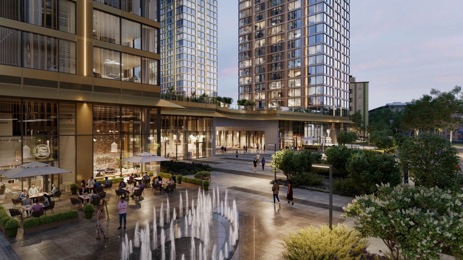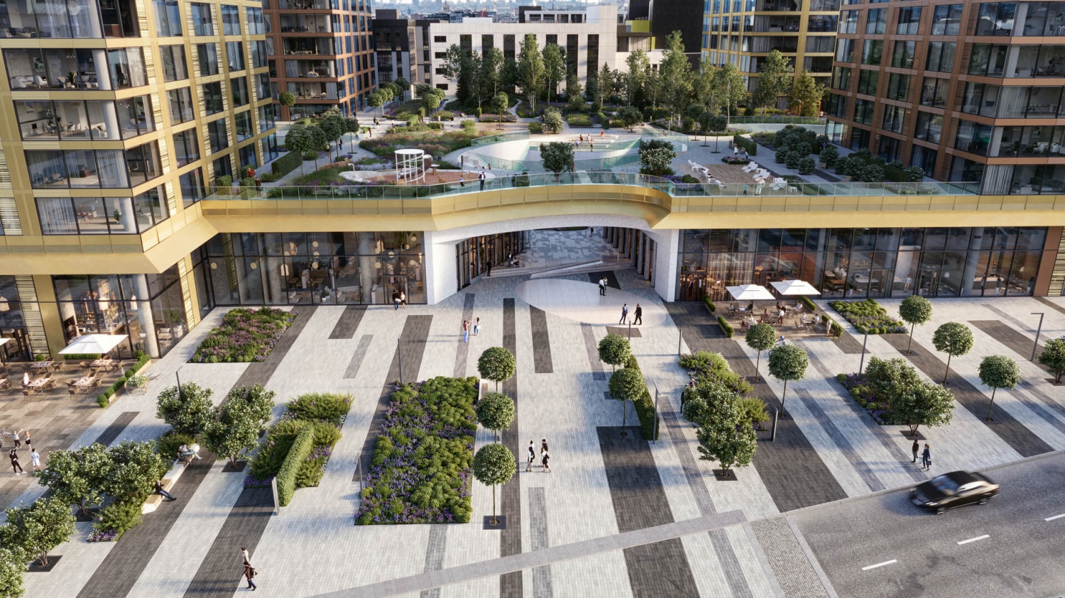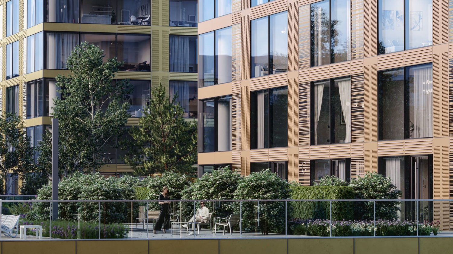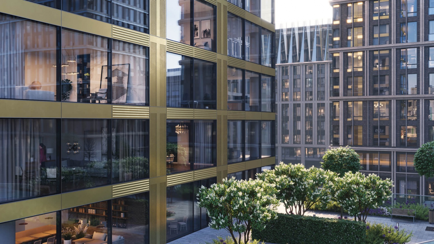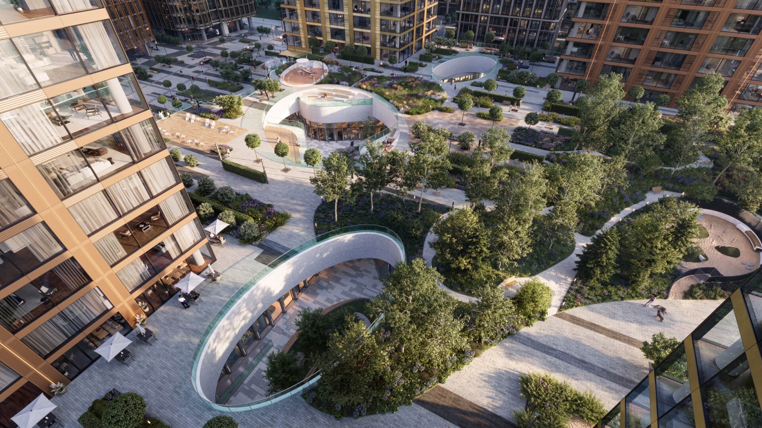 Рядом с комплексом территорию благоустраивают сотрудники бюро Gillespies. Придомовая территория скоро будет наполнена многолетними деревьями. Здесь появятся каштаны, клены, вязы. Обустроят открытую оранжерею, место пруда, где появится фонтан с беседками. Для прогулок создадут центральный променад. Спортивные занятия можно будет организовать на площадках и игровых зонах. На нах поместят безопасное прорезиненное покрытие. Предусмотрят наличие зон, где можно будет играть детям трех до десяти лет.