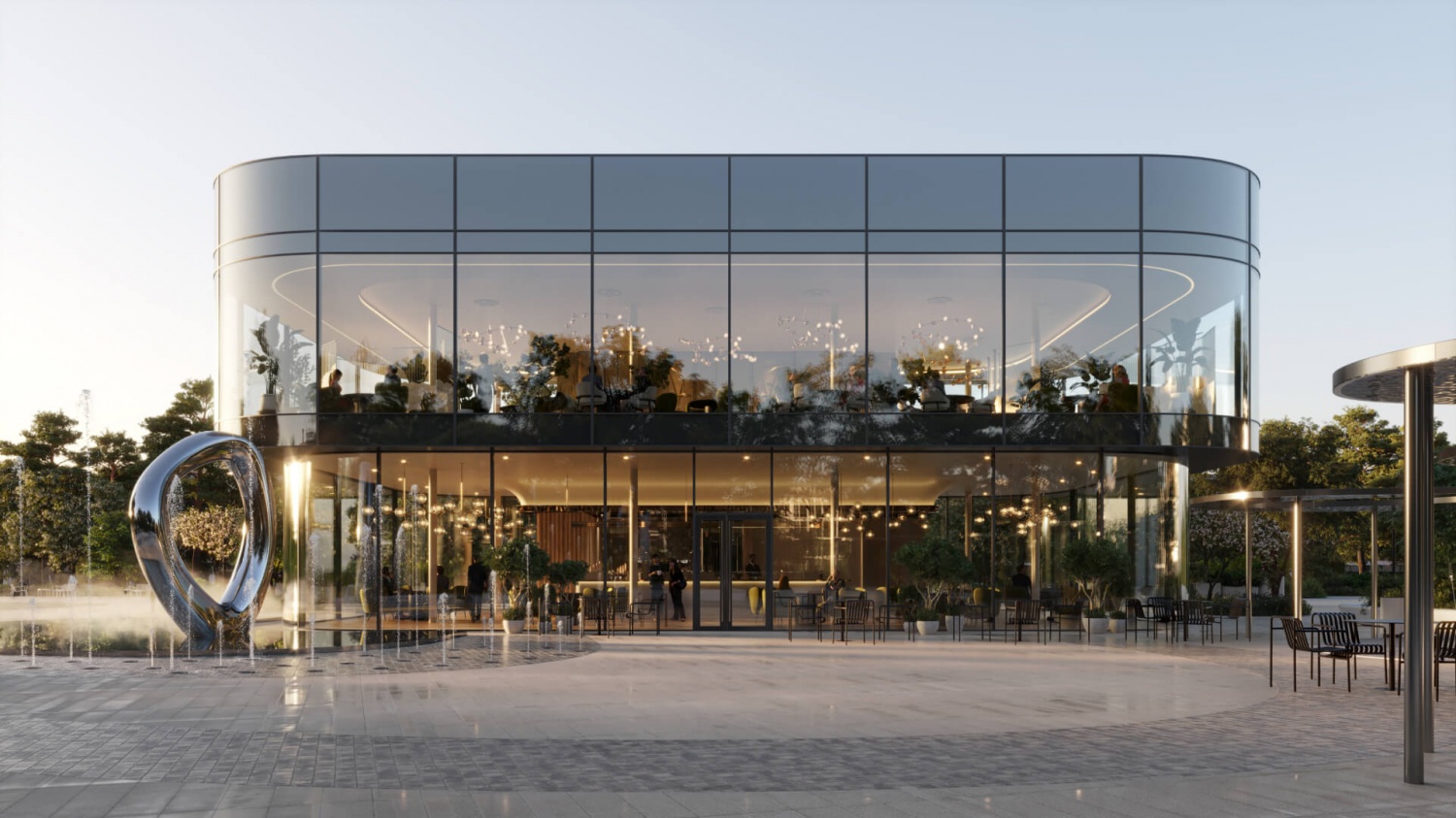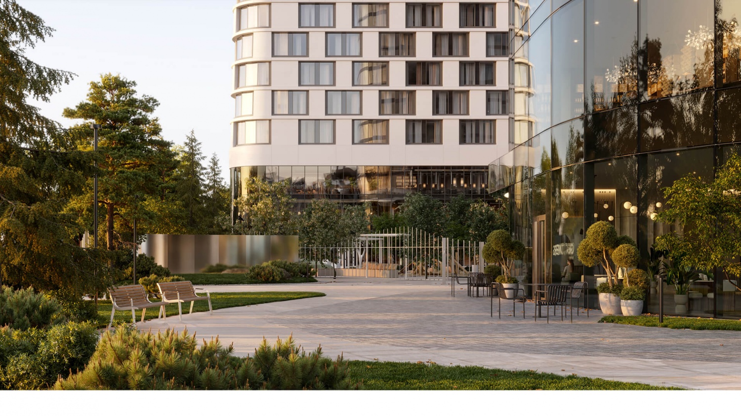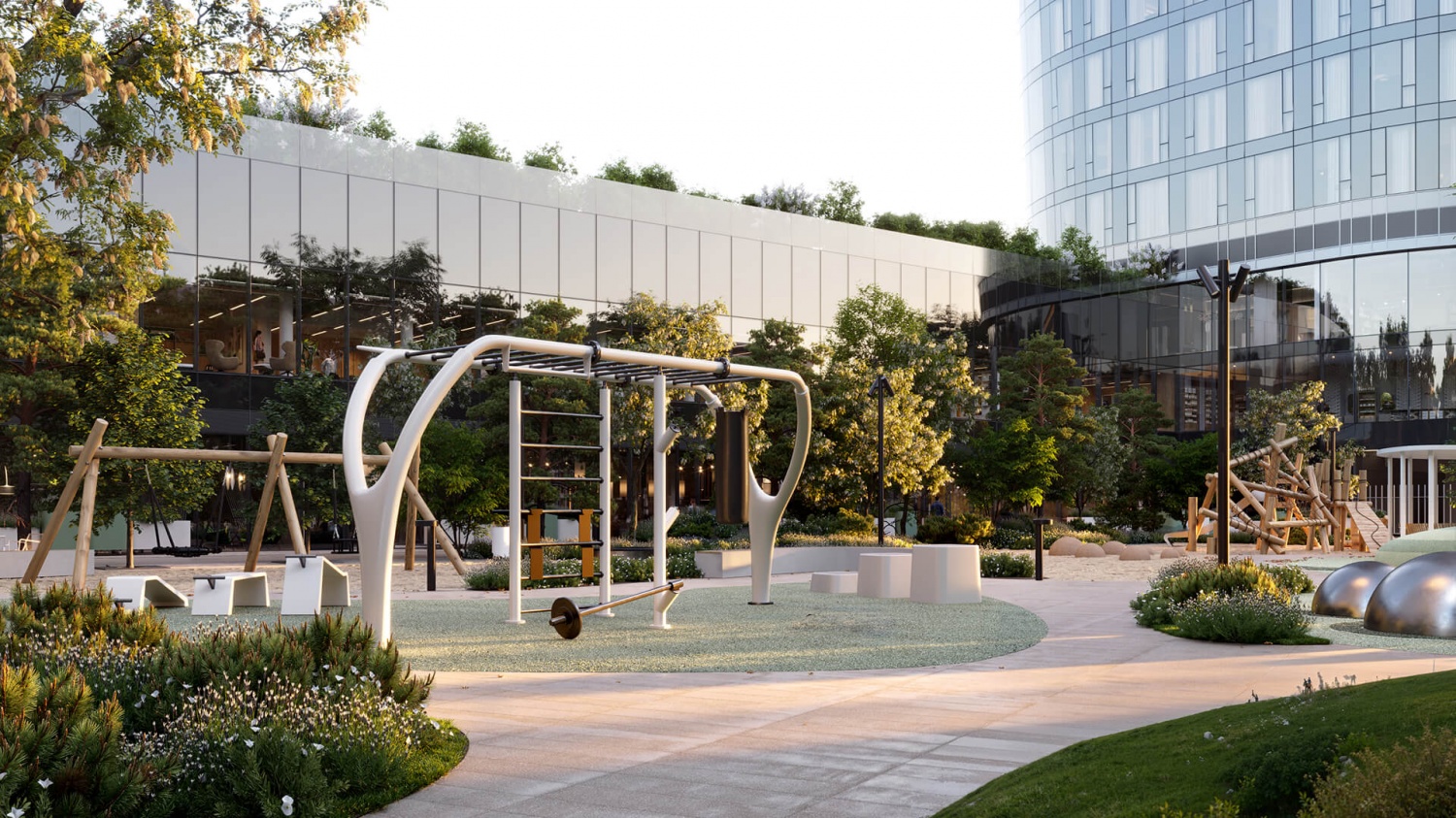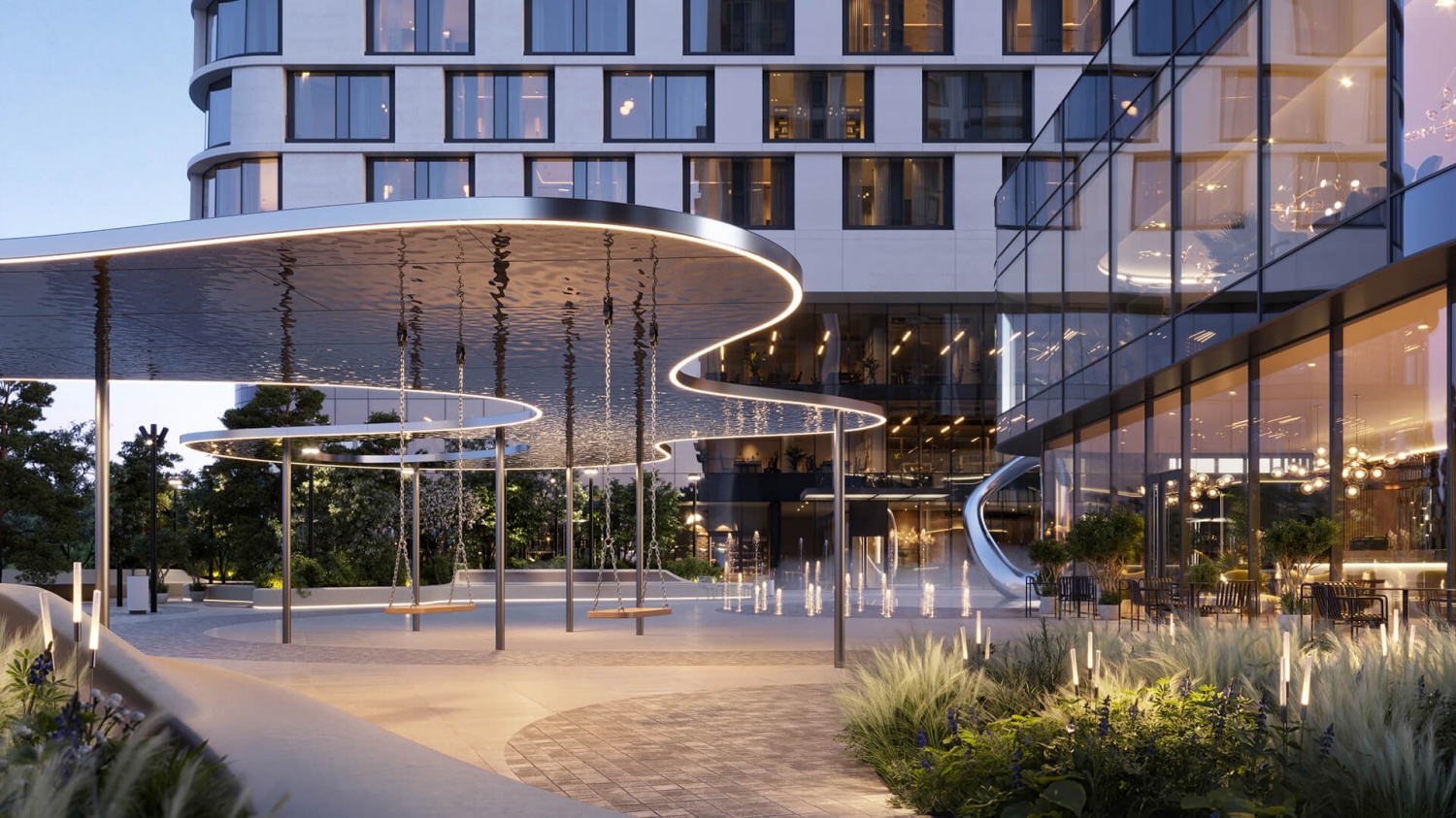 — Приватная территория с “созерцательным” благоустройством: есть фонтан, арт-объект, площадки для тихого отдыха.
