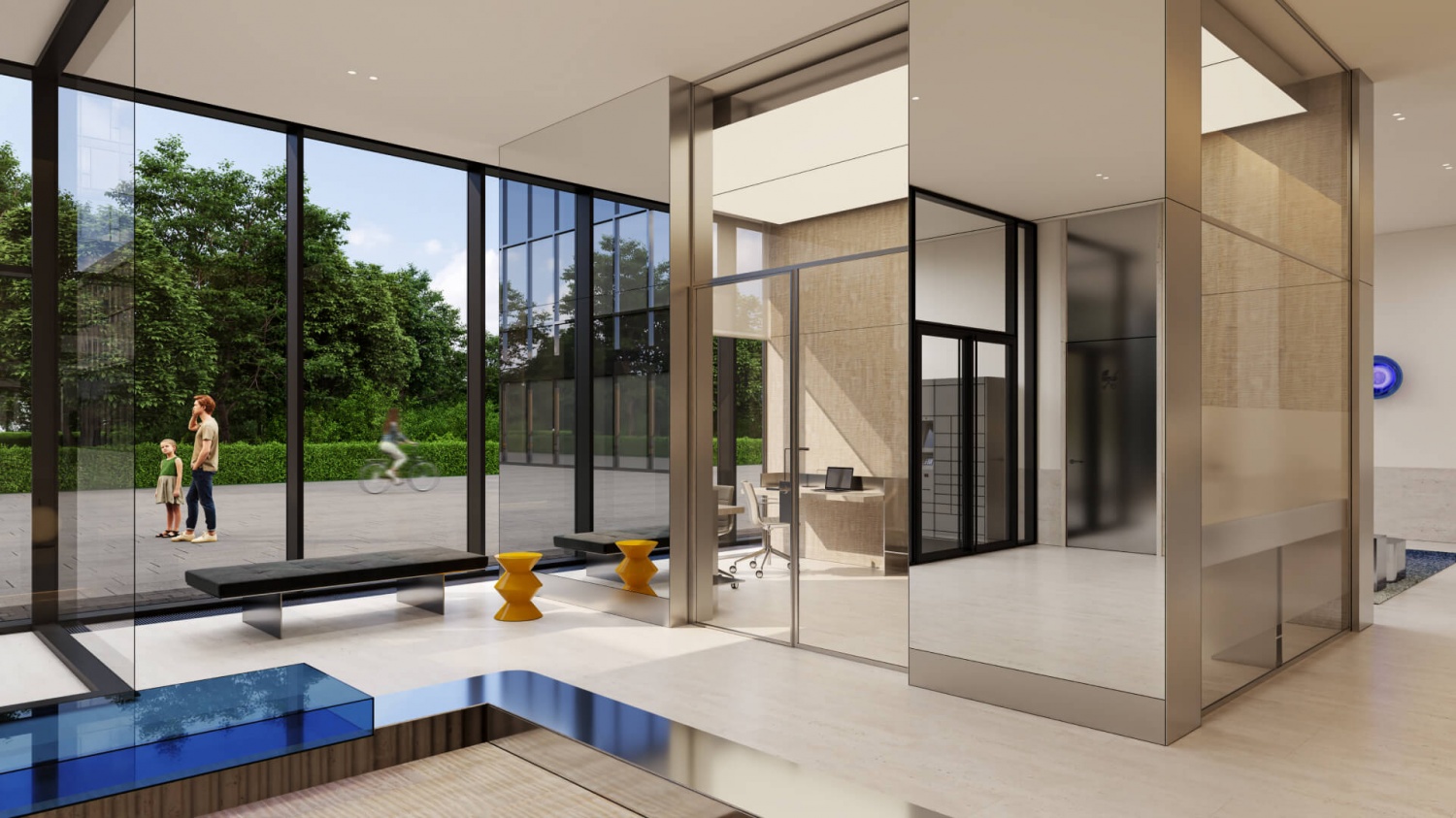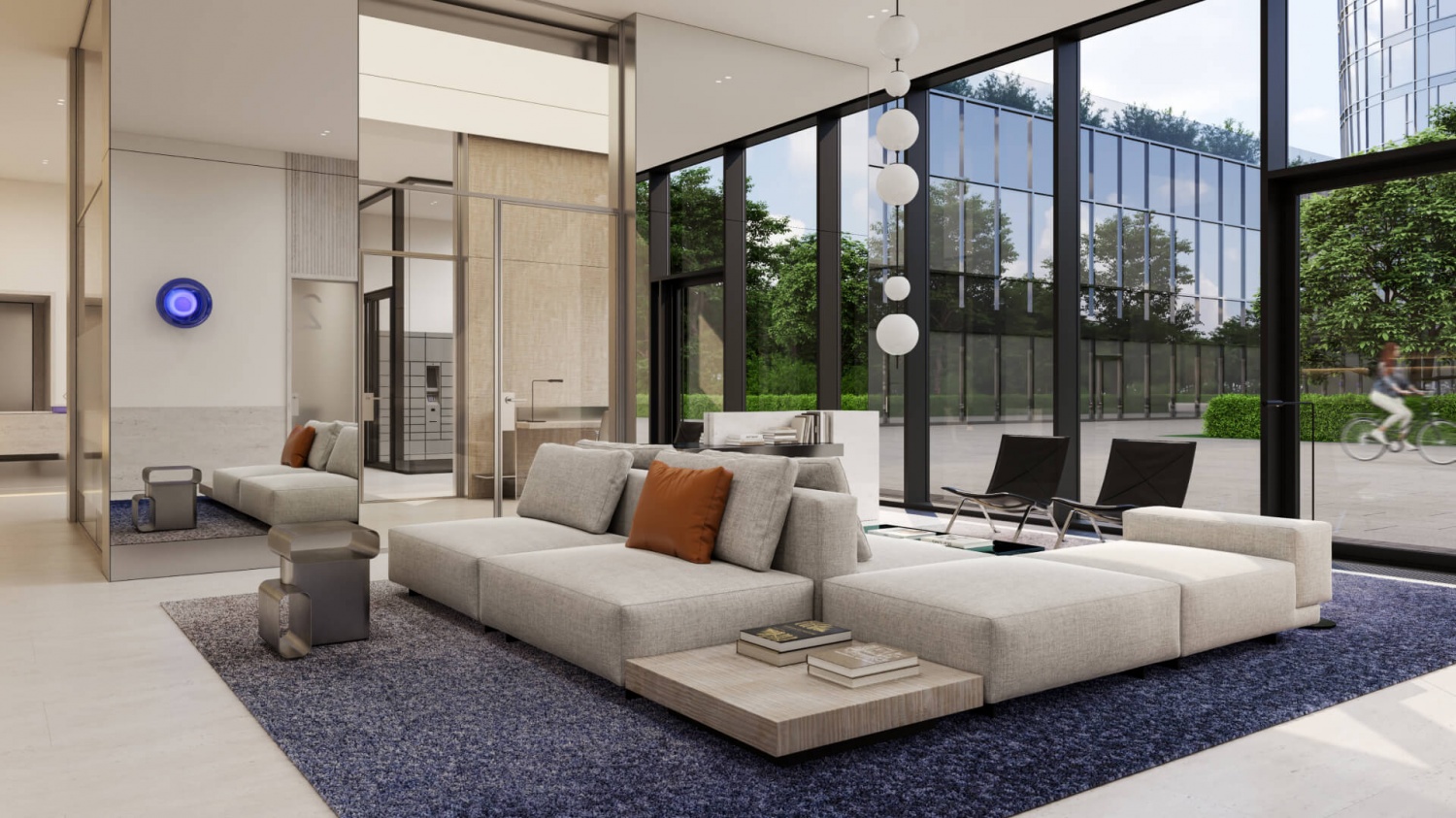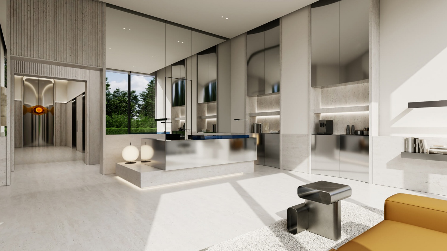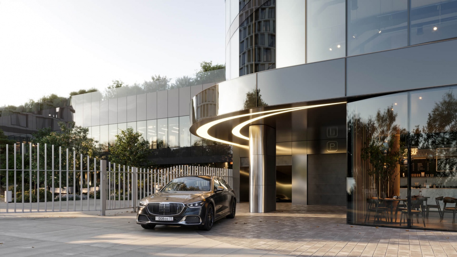 — Приватная территория с “созерцательным” благоустройством: есть фонтан, арт-объект, площадки для тихого отдыха.