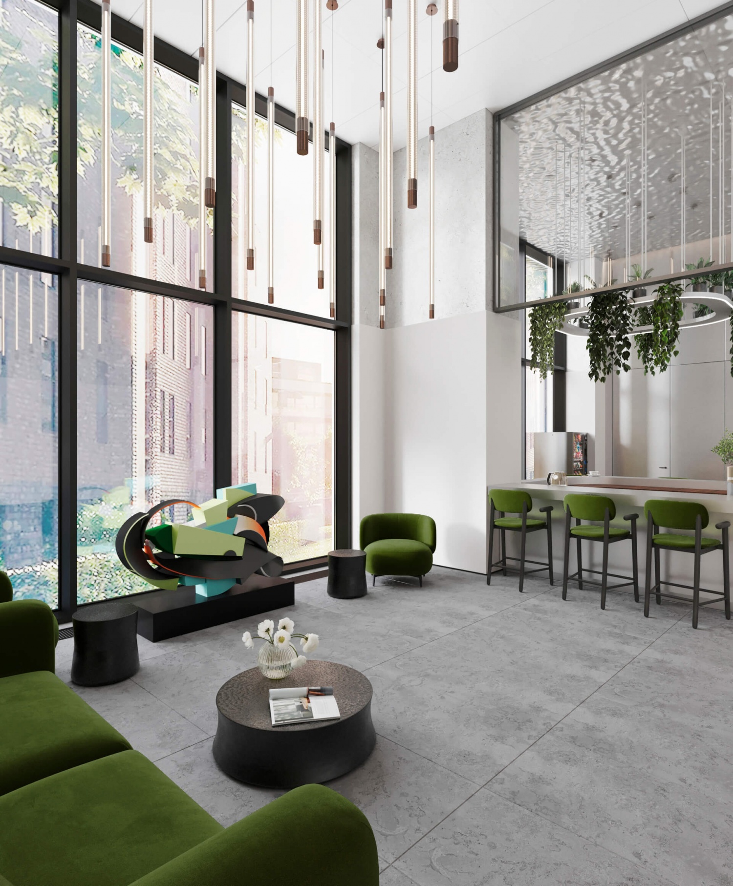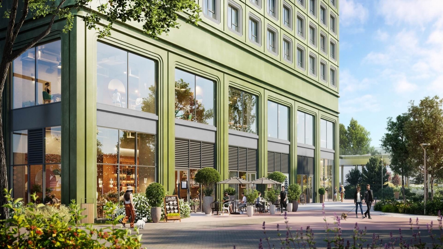 Строительство корпусов осуществляется по монолитной технологии с панорамным остеклением фасадов. Для улучшения энергоэффективности используются материалы с повышенной тепло- и шумоизоляцией. Фасады зданий выполнены в индивидуальных цветовых решениях — от зеленых и медных оттенков до светлых алюминиевых панелей. Между башнями запланирована переходная галерея по благоустроенной кровле. Лобби корпусов будут иметь двойные выходы: на улицу и во внутренний закрытый двор.
