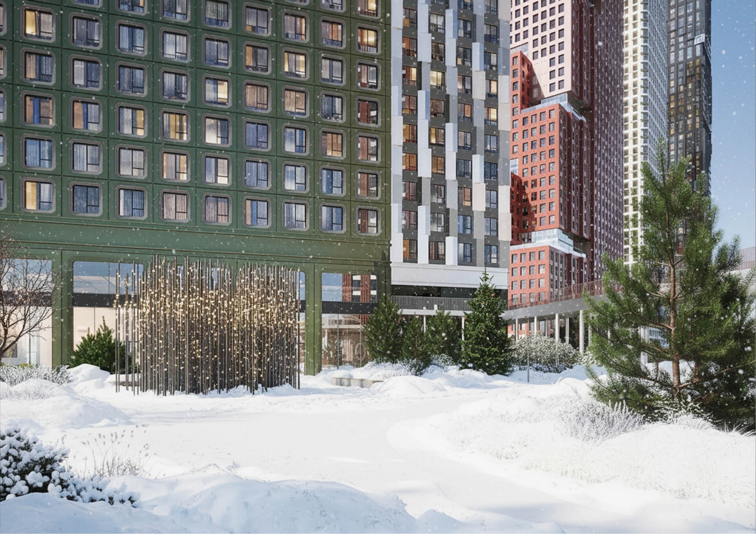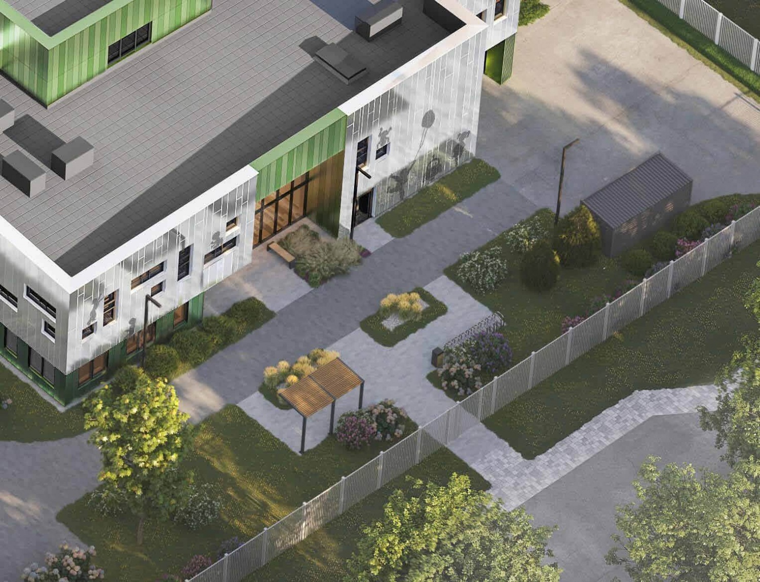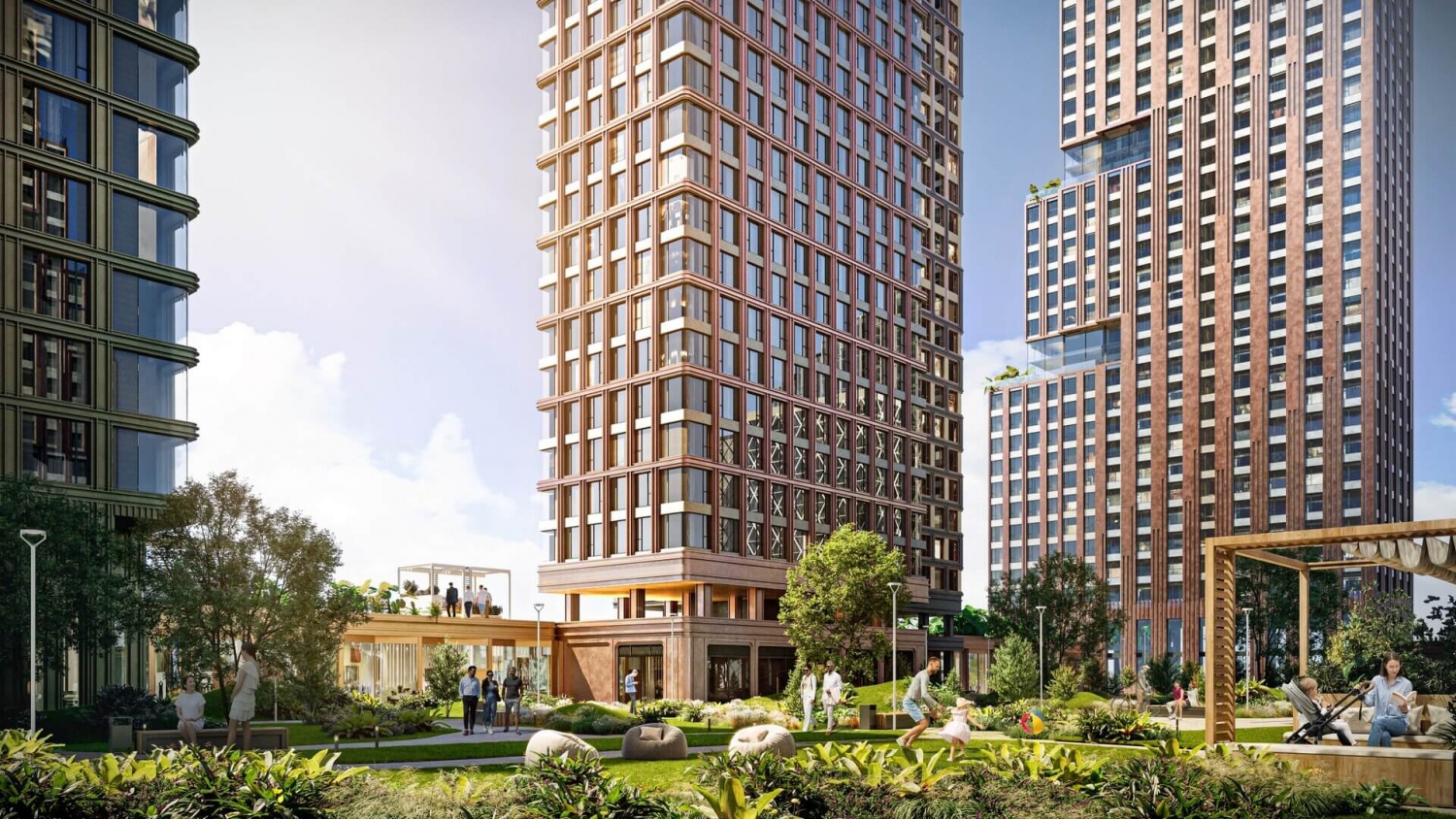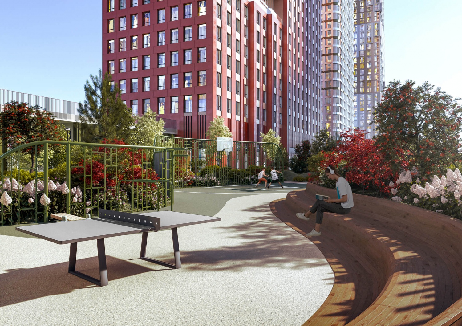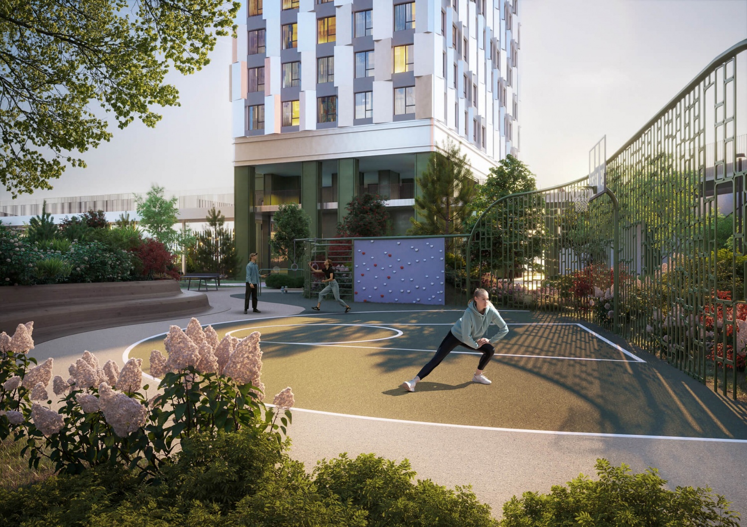 Территория комплекса включает детские и спортивные площадки, арт-пространство «Люминетика», амфитеатр для мероприятий, беседки и теплицы для садоводства. А двухуровневый ландшафтный дизайн дворовых пространств создает гармоничное сочетание с природой и комфортную среду для досуга на свежем воздухе.