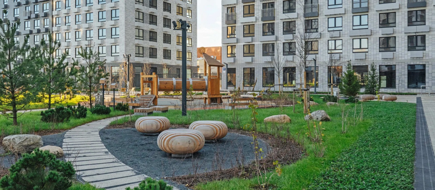 Возле жилого дома будет создан благоустроенный двор, закрытый от автомобилей. Во дворе будут устроены детская и спортивная площадки, сквер для выгула собак, зоны отдыха и велосипедных дорожки. Застройщик также возьмет на себя озеленение территории.